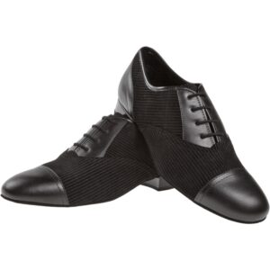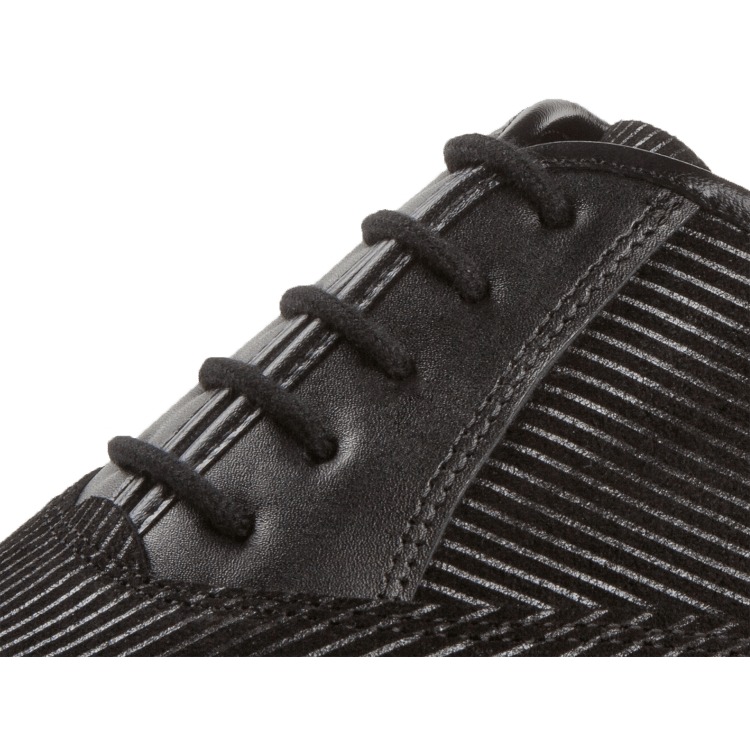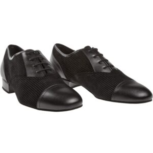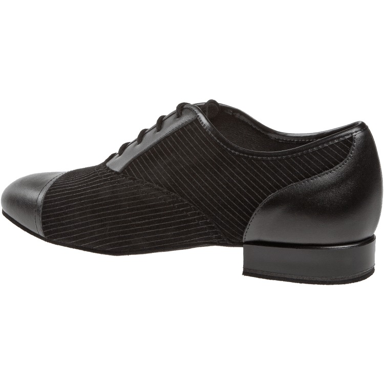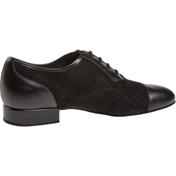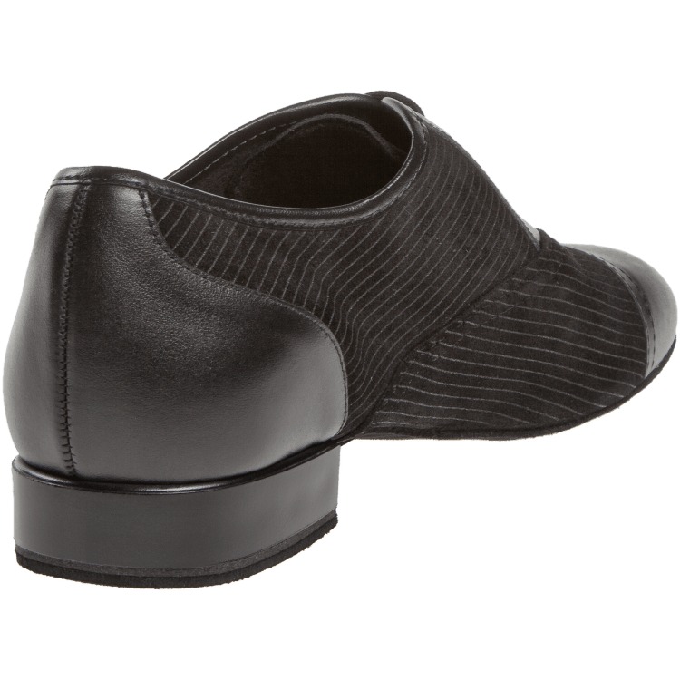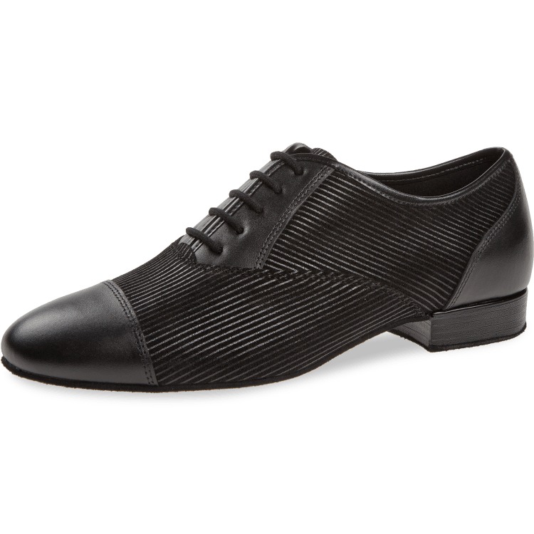 Mod. 077 Diamant mens dance shoes made in Germany handcrafted in classic captoe Oxford style with closed 5-hole lacing. This dance shoe is manufactured in width G (regular) equipped with a shock-absorbing 2 cm standard heel. As interior lining a breathable and moisture-absorbent microfiber from an Italian premium producer is used. For the upper materials made out of black leather combined with black suede laser with pinstripe design soft leathers from Italy are used.