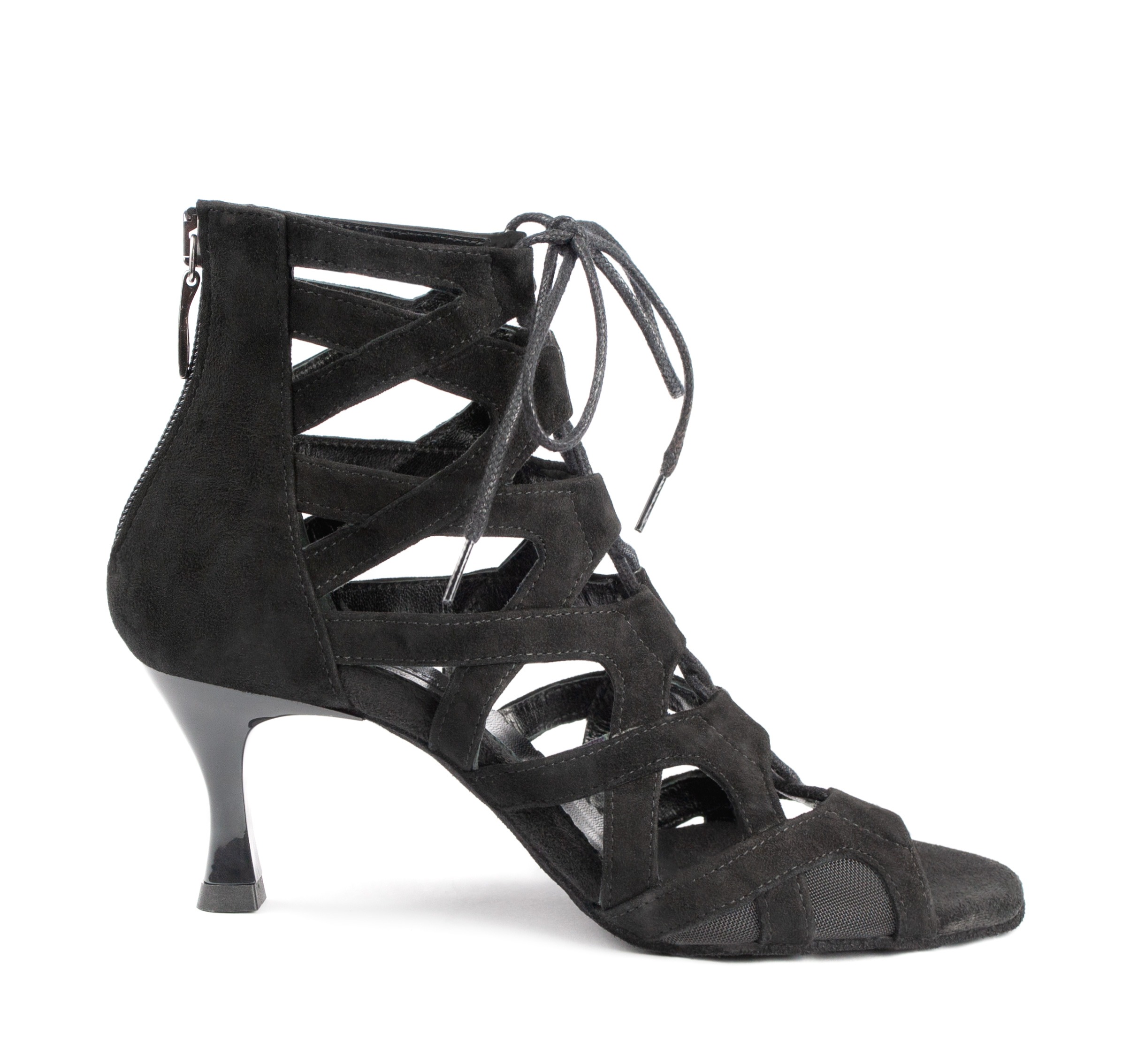 The PD804 Black Nubuck with 60mm heel is a striking black suede boot-like social dance shoe that laces up the front making it fully adjustable, and once you have the laces done up the boot can be easily removed or put on using the zipper at the back. The cut outs near the toes have a net insert, which protects the baby toe from getting caught between the straps.