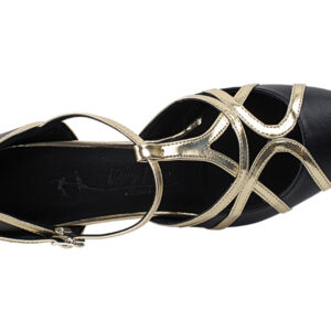 Lekre dansesko i sort skinn med stropper og detaljer i gull.
